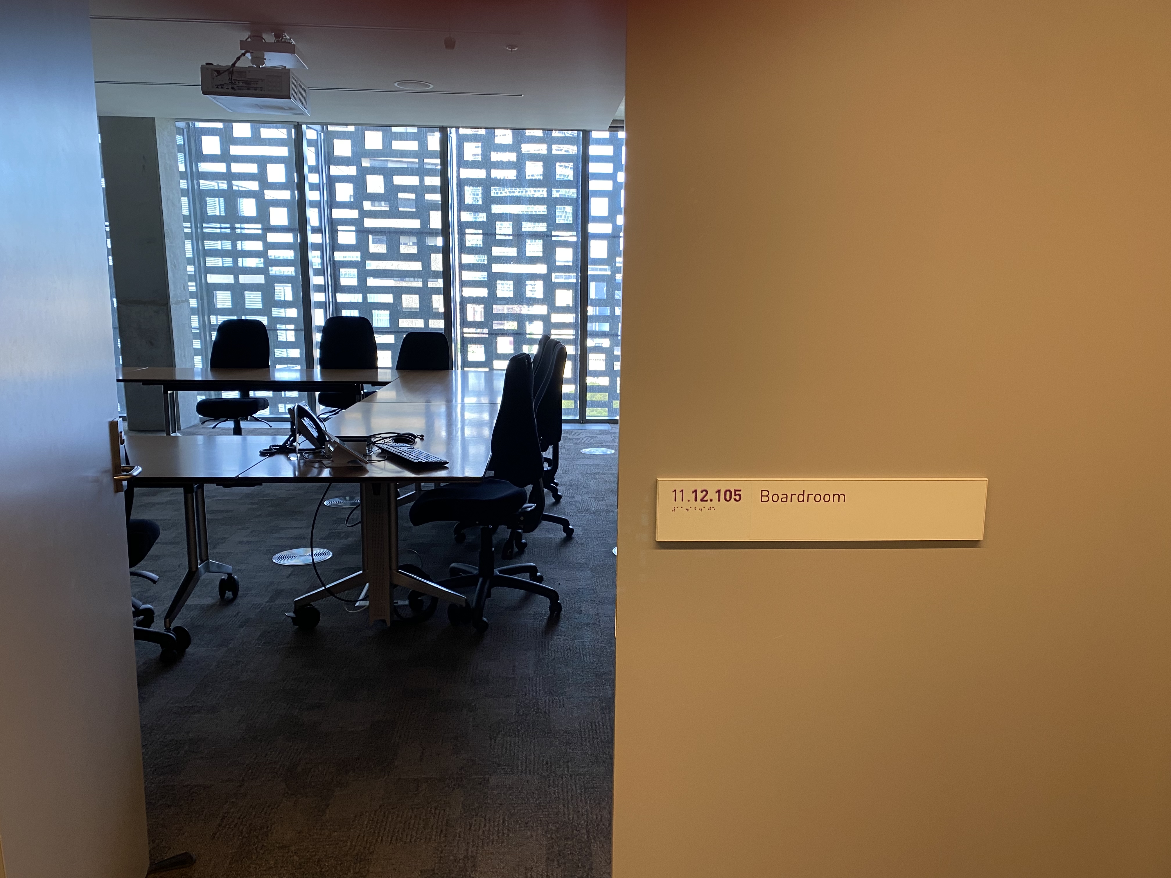 In Building 11 at UTS, take lift to level 12 walk straight ahead past the reception counter and turn right. Look for boardroom with big desk in the middle with number 105.